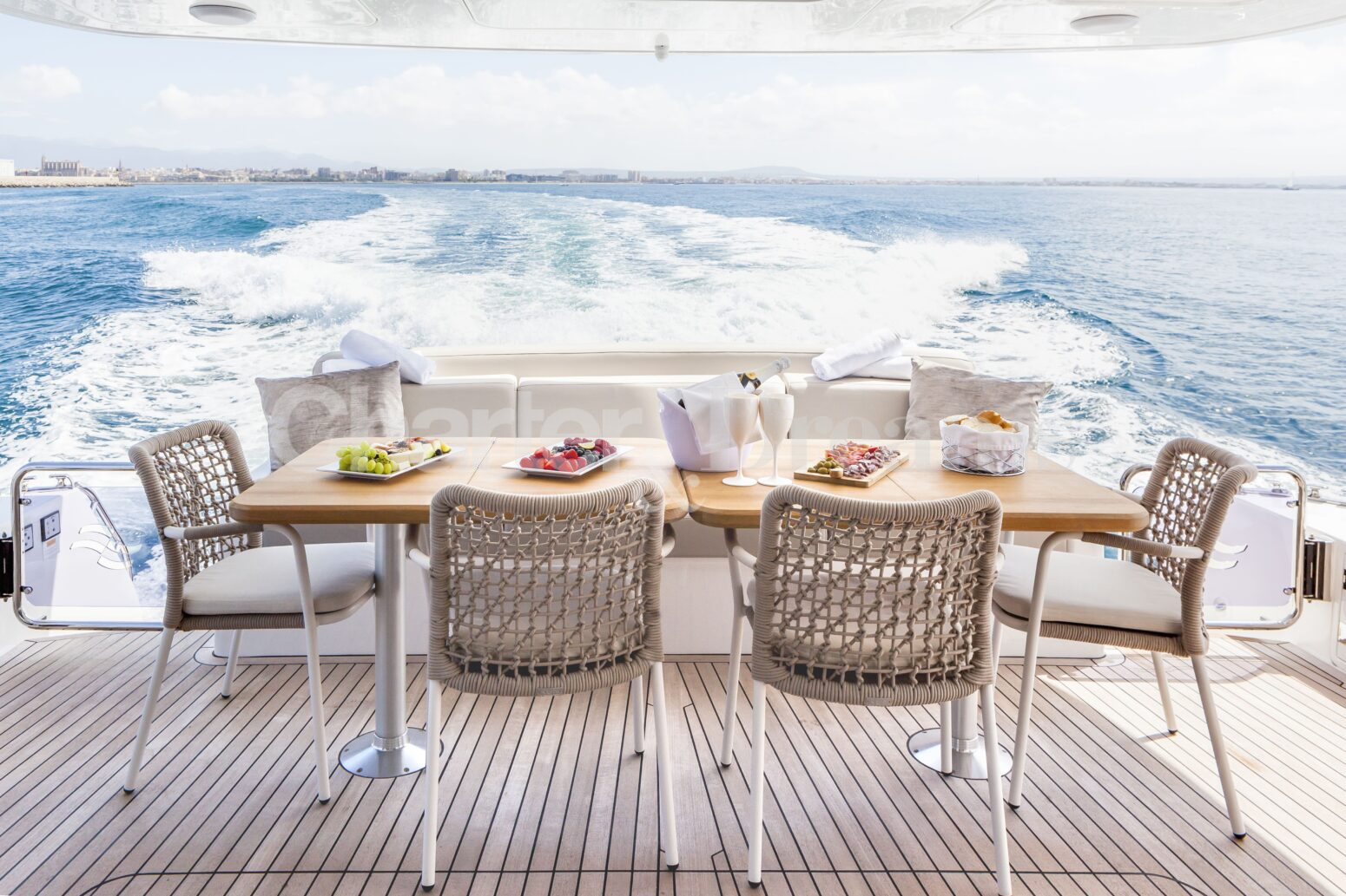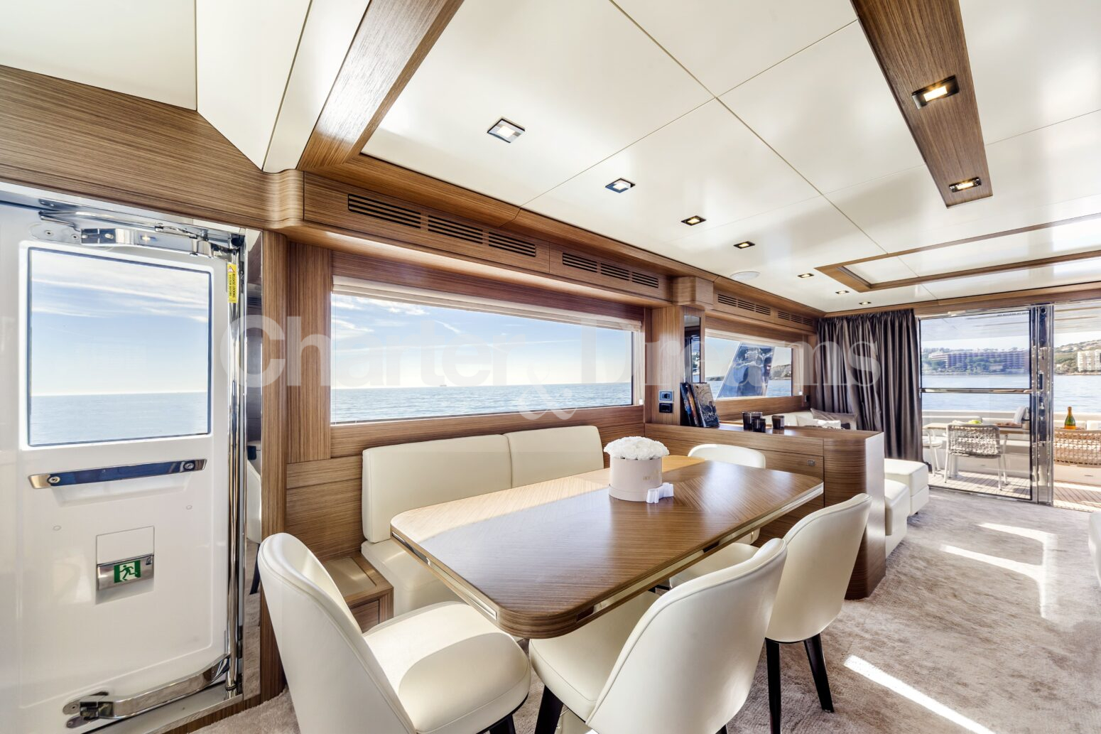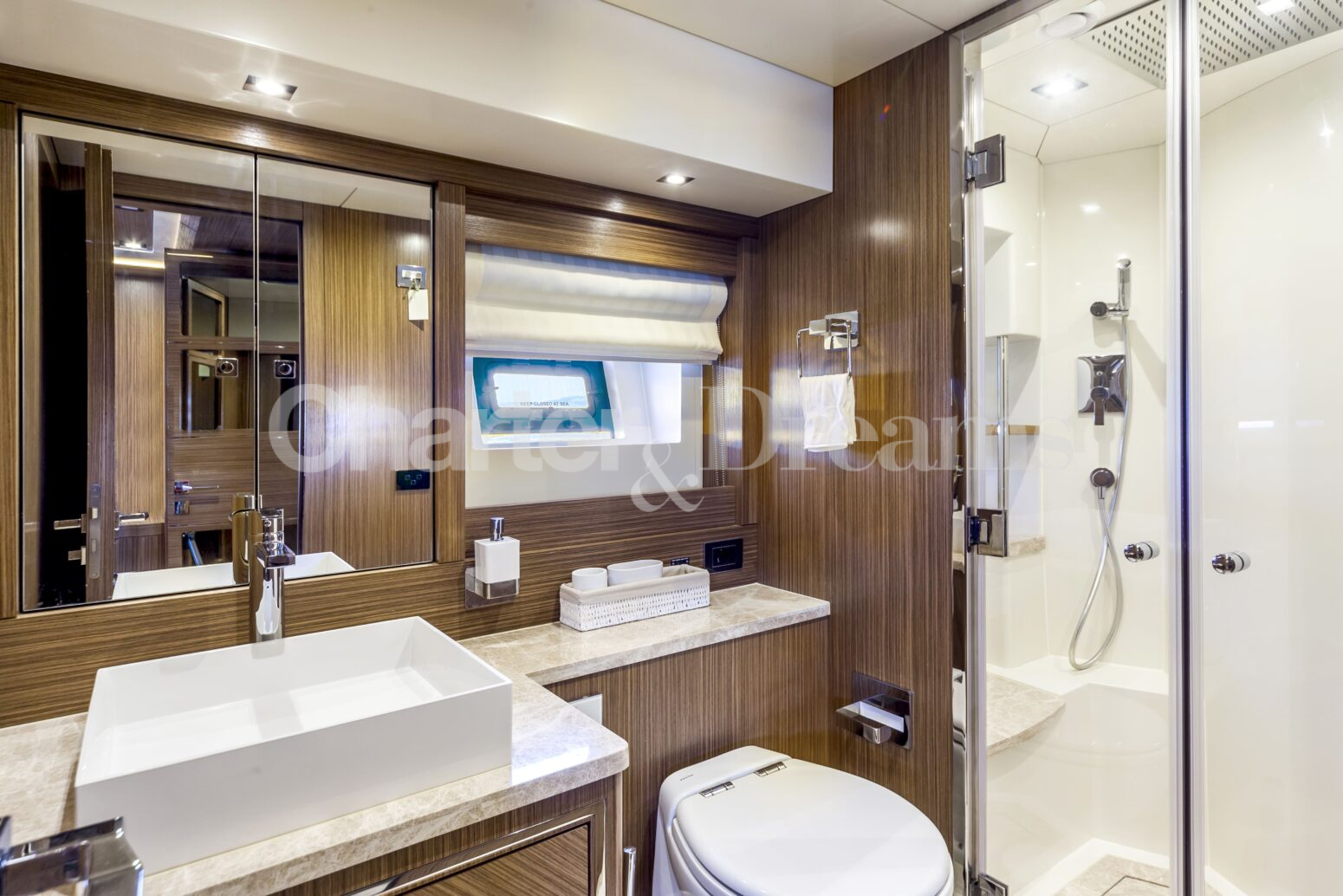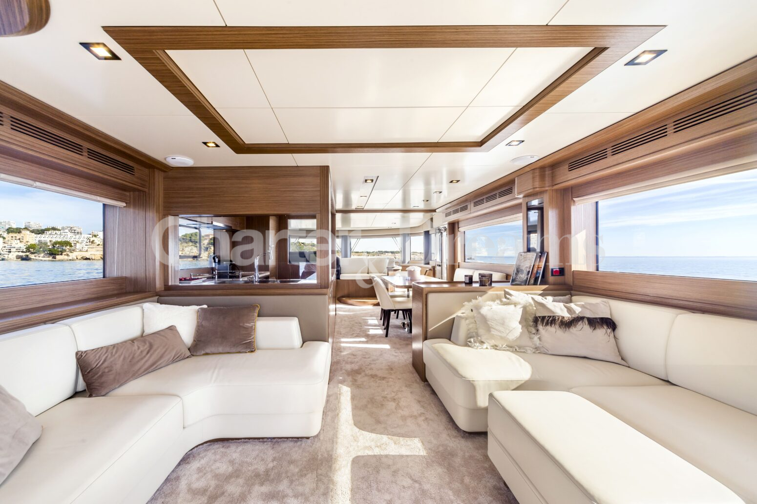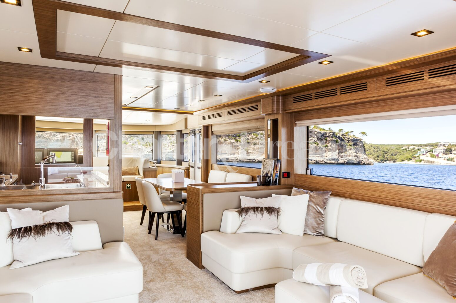 Genießen Sie Mahlzeiten im Freien auf dem Achterdeck, entspannen Sie auf dem großzügigen Vordeck oder verbringen Sie Zeit auf der Flybridge — ideal für Sonnenuntergänge, Drinks und entspanntes Küstenfahren. Im Inneren erwartet Sie ein heller, moderner Salon mit gemütlichem Lounge-Bereich und Essplatz. Seakeeper-Stabilisatoren sorgen jederzeit für eine ruhige und komfortable Fahrt.